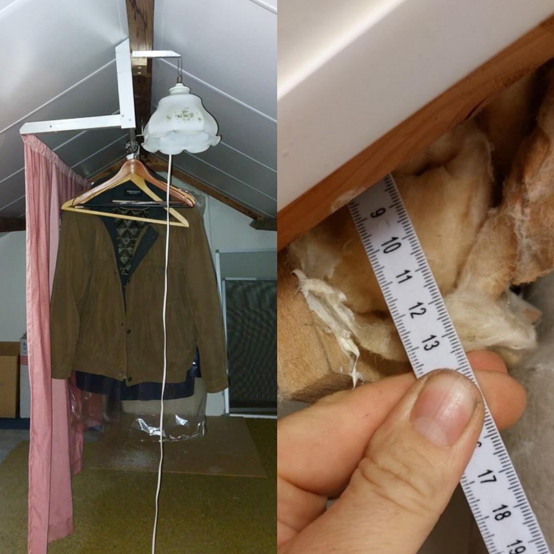 Maak een overzichtsfoto van de zolder. We kunnen daaraan zien of het dak aan de binnenzijde geïsoleerd is. Wanneer mogelijk maakt u een foto van de dikte van de isolatie, zie enkele voorbeeldfoto’s hieronder.