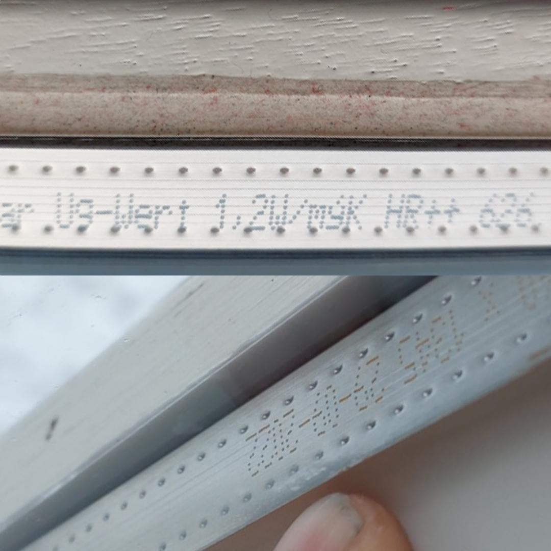 Bij dubbel glas kan er sprake zijn van meerdere types. Vaak staat in de metalen strip tussen de twee glasplaten tekst gedrukt. Soms staat er een datum, soms een code. (HR+, HR++) Graag ontvangen we een foto van deze tekst.