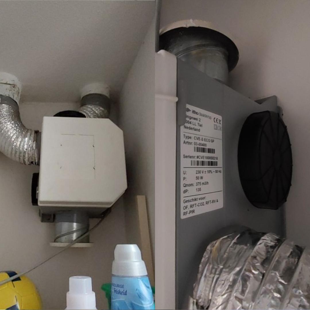 Het ventilatiesysteem hangt vaak op zolder in de buurt van de verwarmingsketel. Fotografeer ook het type en merkplaatje van de MV box in de woning. (indien aanwezig)